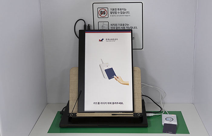 현장투표 투표소에는 투표를 할수 있는 키오스크와 본인인증용 카드 리더기가 있습니다.
